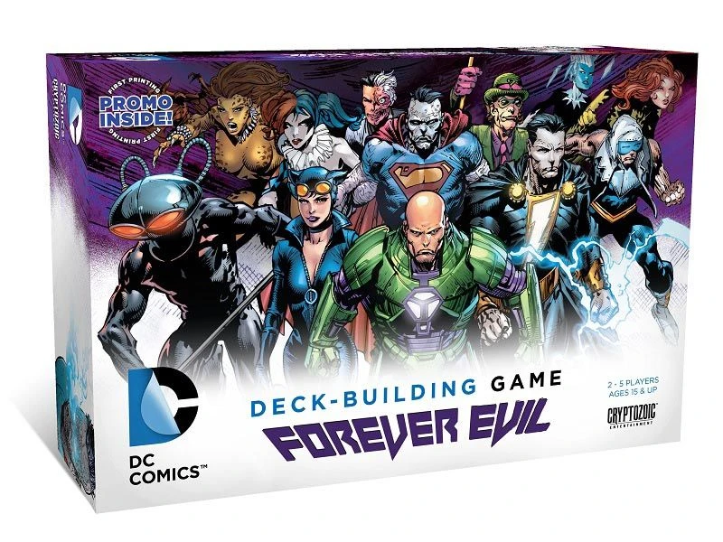 The DC Comics Deck-building Game: Forever Evil, players finally get to play the game as some of the most infamous Super-Villains in the DC Universe. With a name like Forever Evil, you can expect to find new and more dangerous Attacks, rugged Defenses, and a number of nefarious ways to mess with your opponents. Literally dozens of new ways for you to look at your friend and say, „Sorry, buddy.“