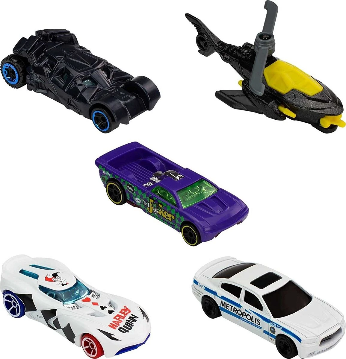 Sofortiger Spielspaß mit dem Hot Wheels Batman-Set, bestehend aus 5 Fahrzeugen, von Mattel.
