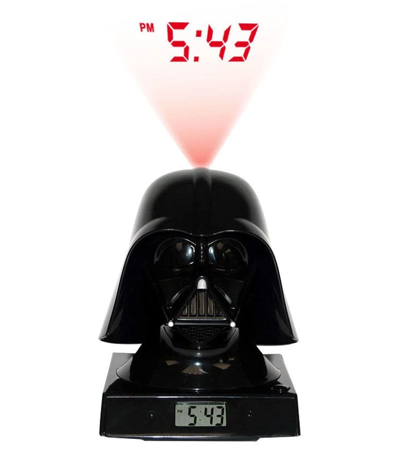 Darth Vaders Kopf als Wecker mit integrierter Zeitprojektion, um die Uhrzeit auch Nachts bequem von der Decke ablesen zu können.