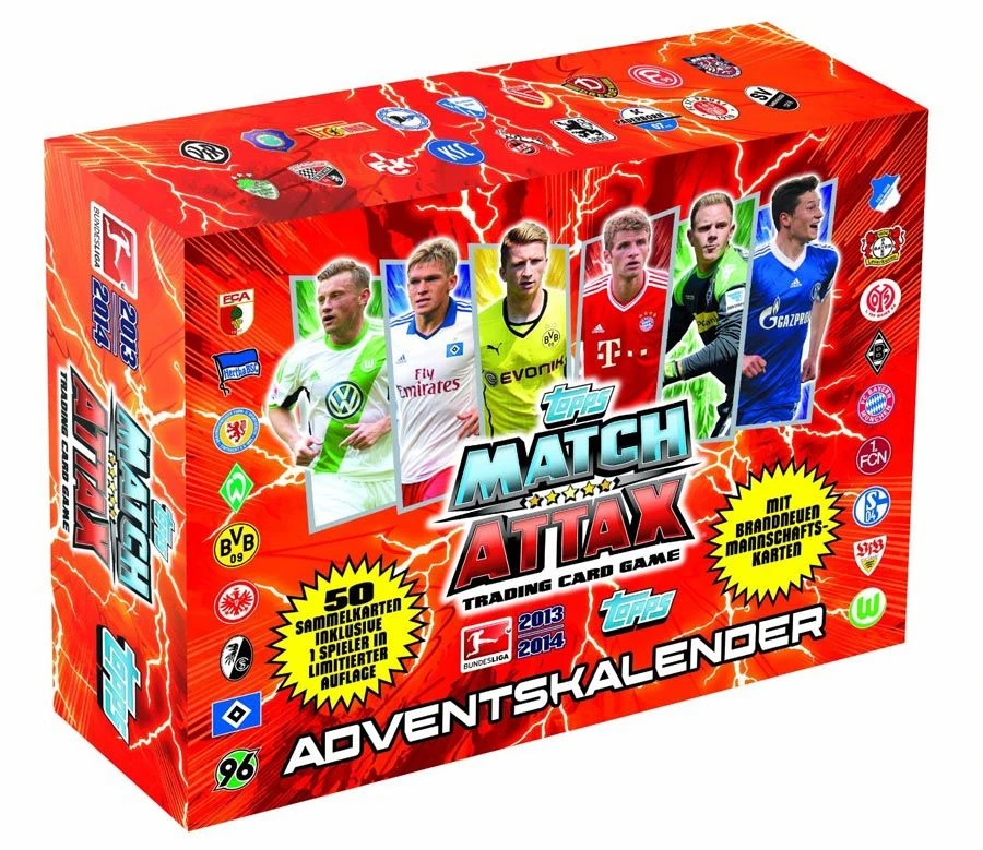 Damit wird das Warten auf Weihnachten für alle Match Attax Sammelkarten-Liebhaber verkürzt. Voll mit den größten Stars der Bundesliga und besonderen Karten ist der Adventskalender zur Bundesliga Saison 2013/2014 eine perfekte Ergänzung für jede Sammlung!