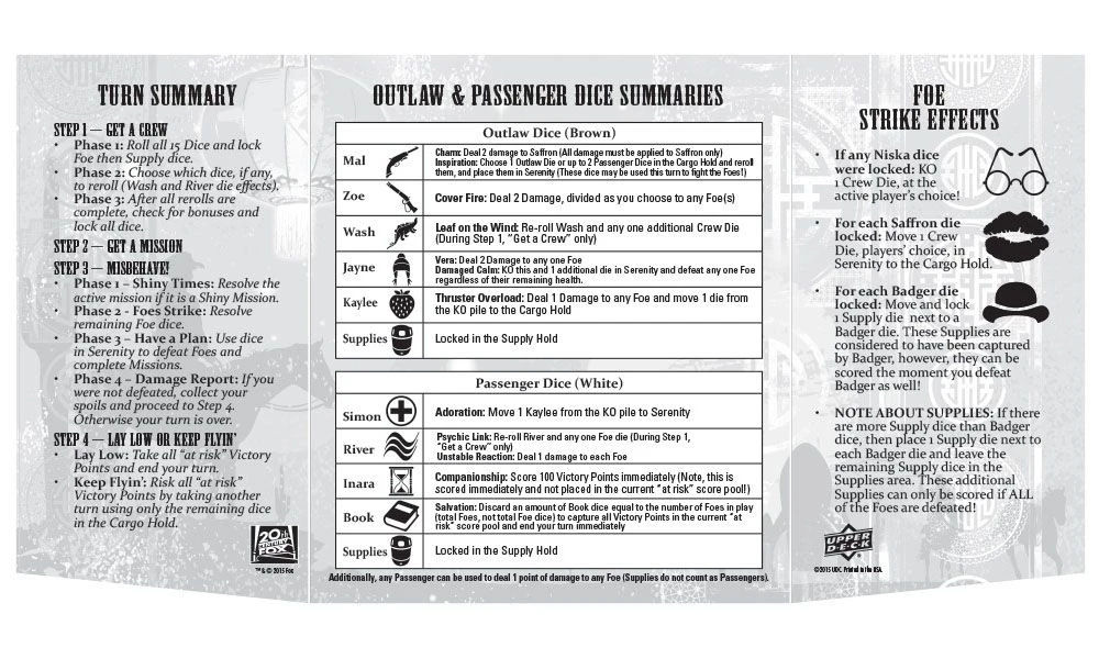 Here’s how it’s played… Firefly™: Shiny Dice is played over a course of 3 rounds. In each round, each player will take a turn. Depending on the outcome of that turn, a player may take additional turns, in a row, pressing their luck, over the course of one round. Remember, this is a press your luck dice game, and while at first, it may seem easy to defeat your Foes, over time, your Crew will tire, and they will need to recoup! Danger lurks around every corner, but with smart teamwork, you can become the “Best in the ‘Verse”!